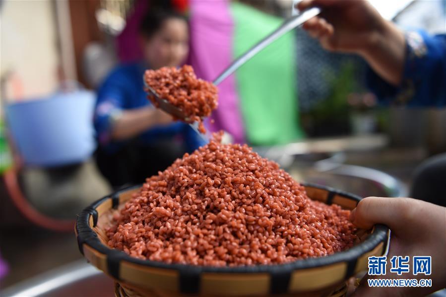4月16日,在貴州省臺(tái)江縣姊妹街哆蝶五彩姊妹飯?bào)w驗(yàn)店,苗家婦女在制作五彩“姊妹飯”。新華社發(fā)(劉開(kāi)福 攝)
