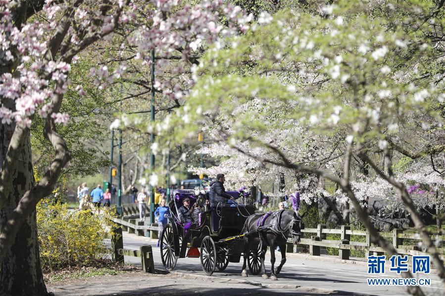 4月16日,人們?cè)诿绹?guó)紐約中央公園乘坐馬車(chē)游玩。 新華社記者 王迎 攝