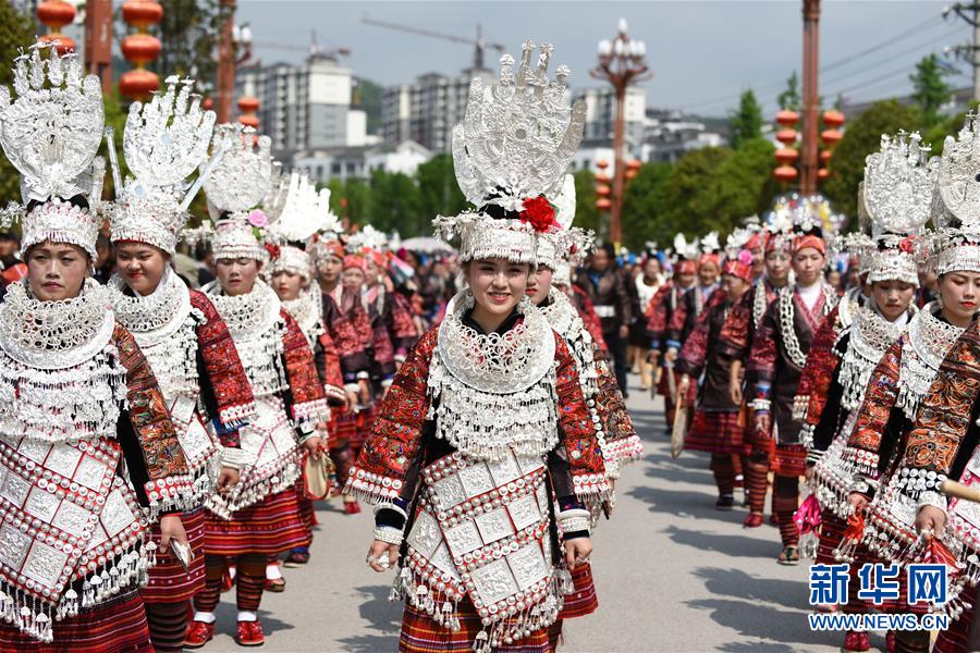4月18日,臺江縣苗族群眾參加盛裝游演活動。 當日,貴州省黔東南苗族侗族自治州臺江縣迎來一年一度的苗族姊妹節(jié)。節(jié)日期間將舉行苗族盛裝游演、千人長桌宴、千人游方體驗、苗族手工創(chuàng)意大賽等一系列活動。 姊妹節(jié)是臺江縣苗族同胞的傳統(tǒng)節(jié)日,2006年被列入第一批國家級非物質文化遺產(chǎn)名錄。 新華社記者 楊文斌 攝