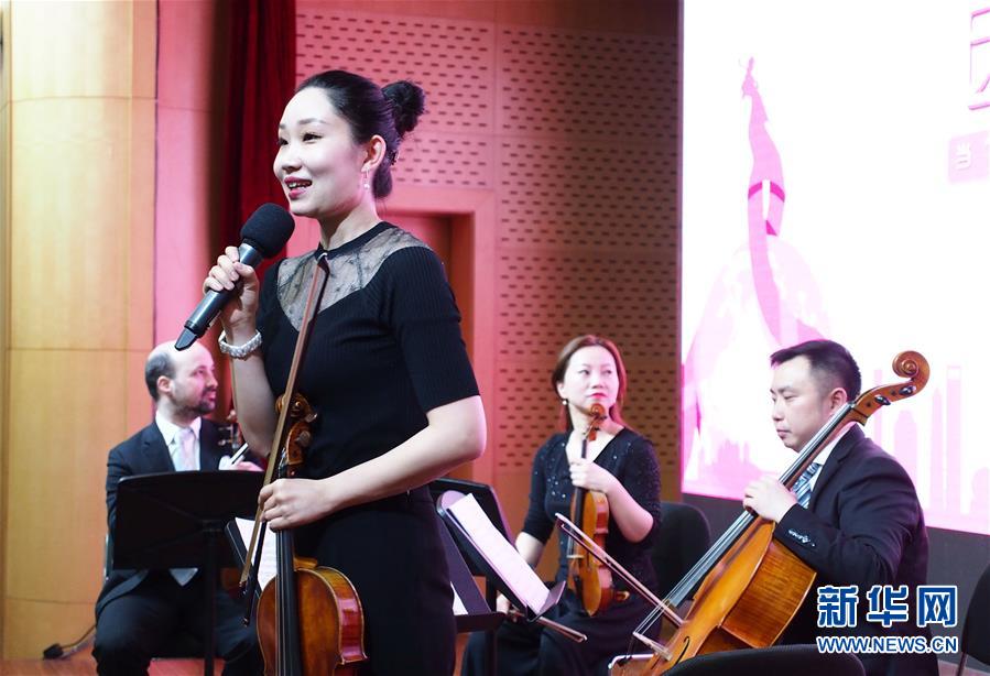 4月25日,上海交響樂團的中提琴手巴桐在演奏前介紹曲目。 當(dāng)日,第一場“全城交響·上交為你而來”音樂會在復(fù)旦大學(xué)附屬腫瘤醫(yī)院報告廳奏響,為患者及醫(yī)護人員獻上一場專屬音樂會?!叭墙豁憽ど辖粸槟愣鴣怼笔巧虾=豁憳穲F2019年向全上海的機構(gòu)及個人開放的公益演出項目。 新華社記者 任瓏 攝