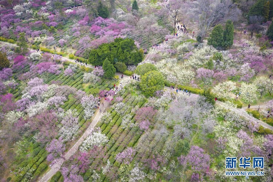游客在江蘇南京梅花山賞花(3月8日無人機(jī)拍攝)。 新華社發(fā)(蘇陽(yáng) 攝)