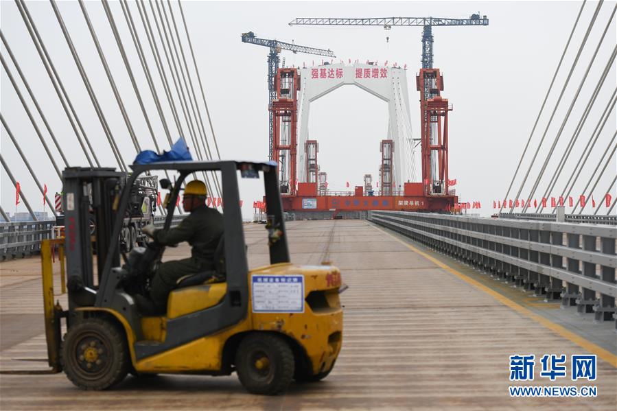 4月26日,施工人員在商合杭鐵路蕪湖長江公鐵大橋合龍現(xiàn)場(chǎng)作業(yè)。