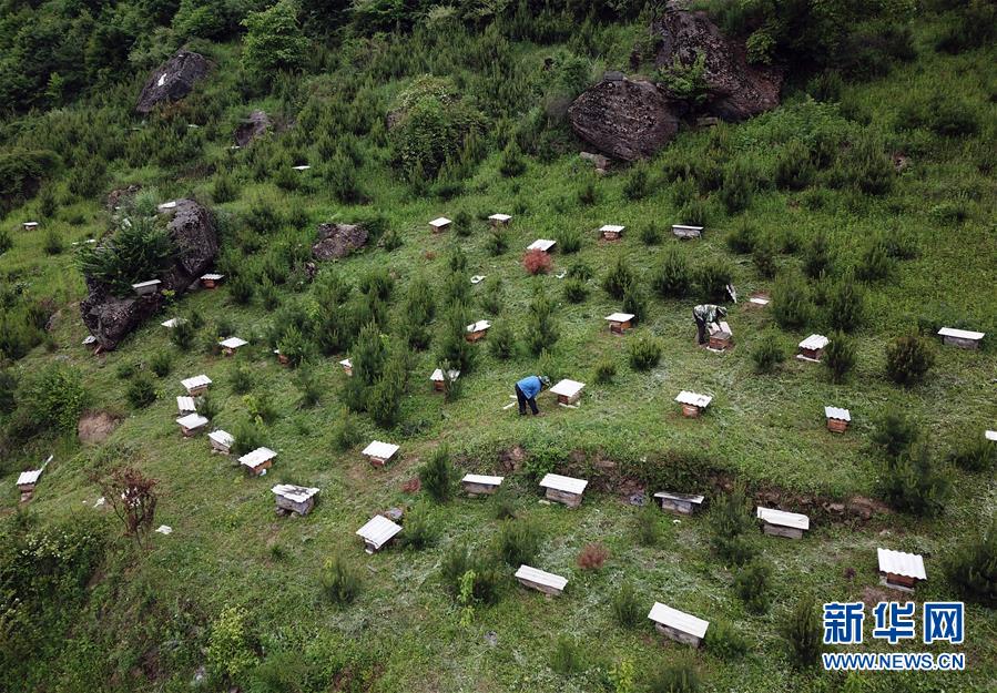 5月10日,在甘肅省隴南市徽縣大河店鎮(zhèn)硬灣村,蜂農(nóng)查看蜂箱情況(無(wú)人機(jī)拍攝)。 甘肅省隴南市徽縣大河店鎮(zhèn)硬灣村位于秦巴山區(qū)深處,2017年,在當(dāng)?shù)卣姆龀窒?,龍崖老巢蜜養(yǎng)殖農(nóng)民專業(yè)合作社成立,蜂農(nóng)們將傳統(tǒng)養(yǎng)蜂技藝和現(xiàn)代加工方式相結(jié)合,并通過(guò)電商等渠道打開銷路,有效帶動(dòng)了當(dāng)?shù)刎毨Т迕衩撠氈赂弧D壳罢麄€(gè)合作社共有蜂箱2000余個(gè),每箱每年可帶來(lái)三四千元的收入。 新華社記者 馬寧 攝