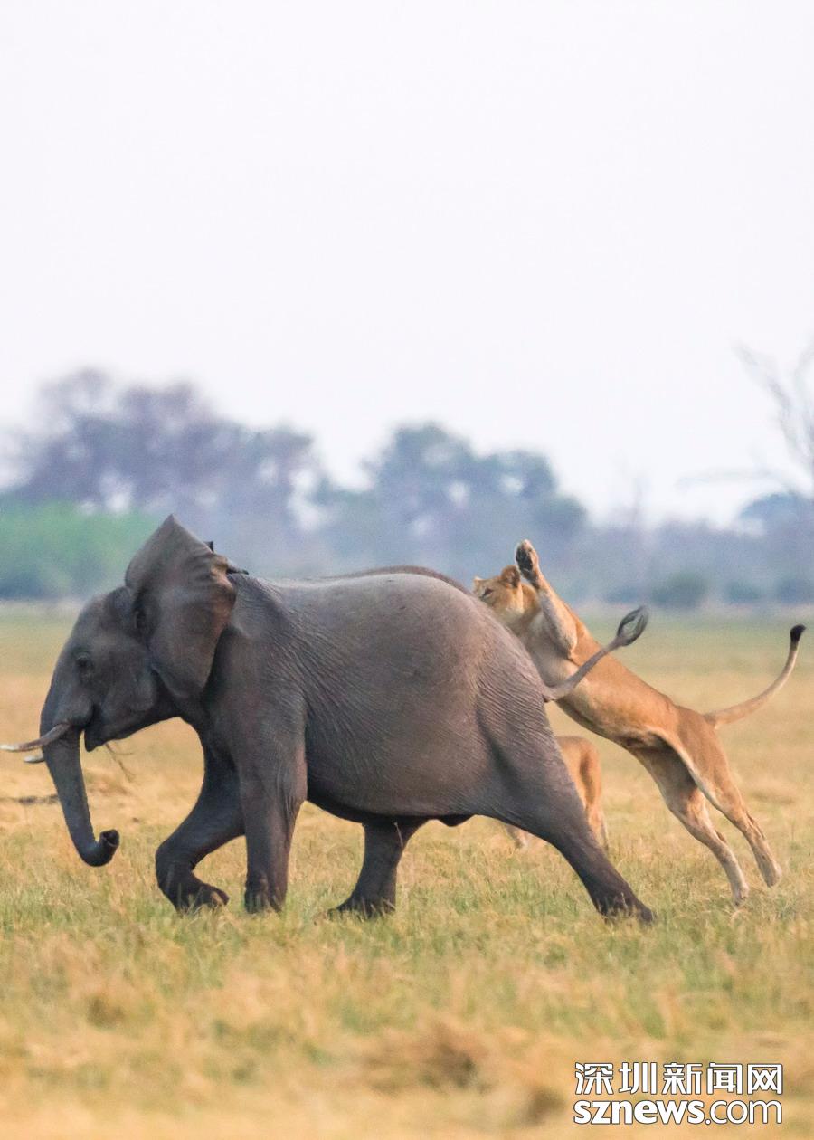 英國(guó)攝影師詹姆斯(James Gifford)在博茨瓦納喬貝國(guó)家公園拍到一群獅子獵食大象的精彩畫面。在詹姆斯的鏡頭下,一頭母獅跳到了一頭小象的背上想要將其拿下,但僅憑一己之力又不能做到。但當(dāng)母獅的后援抵達(dá)時(shí),象群也趕到了現(xiàn)場(chǎng)。最終,小象回到了象群中獲得庇護(hù),而獅群也不得不悻悻離去。