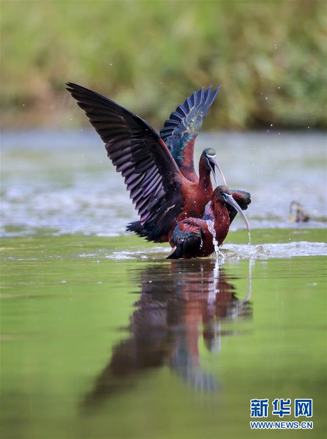 這是在漢江濕地公園嬉水的2只彩鹮(5月4日攝)。 近日,國家二級保護動物彩鹮現(xiàn)身陜西省漢中市漢江濕地公園濂水河與漢江交匯處。 據(jù)陜西師范大學生命科學院教授于曉平介紹,彩鹮在世界上的分布比朱鹮還要少,這幾年在云南發(fā)現(xiàn)得多一些,這3只彩鹮現(xiàn)身漢江濂水河畔,是陜西首次發(fā)現(xiàn)彩鹮蹤跡。 據(jù)了解,彩鹮是國家二級保護動物,屬鵜形目鹮科,體羽大部為青銅栗色,是珍稀鳥類朱鹮的“近親”,體型比朱鹮略小。 新華社發(fā)