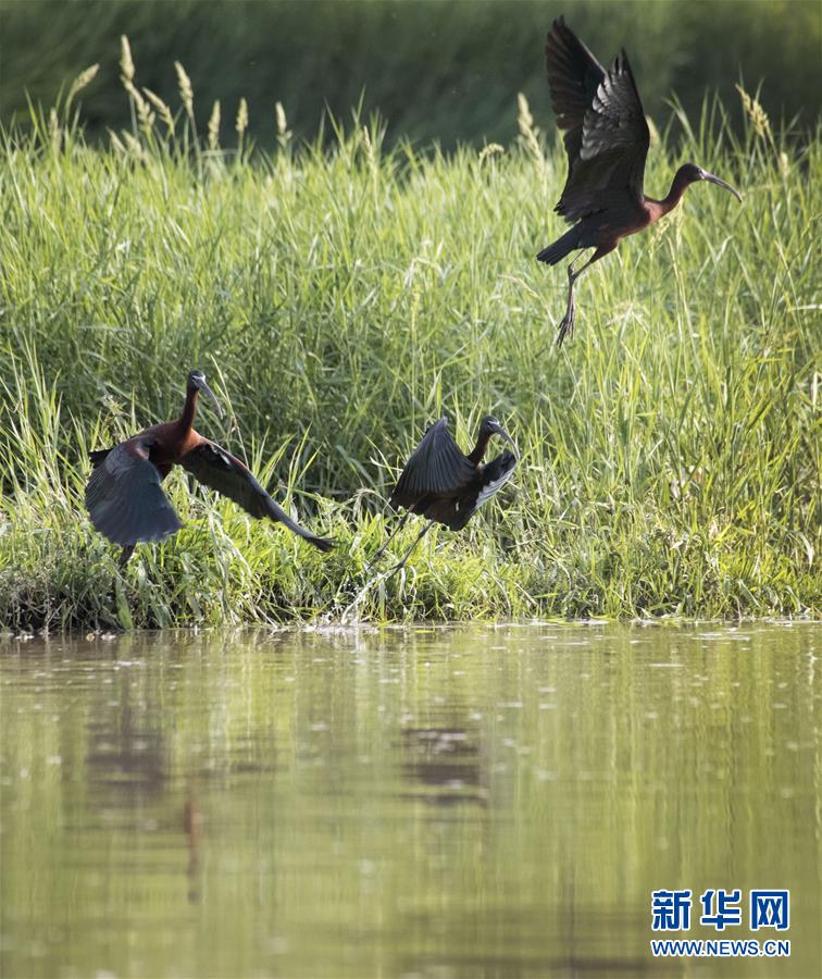 這是在漢江濕地公園飛翔的3只彩鹮(4月29日攝)。 近日,國家二級保護動物彩鹮現身陜西省漢中市漢江濕地公園濂水河與漢江交匯處。 據陜西師范大學生命科學院教授于曉平介紹,彩鹮在世界上的分布比朱鹮還要少,這幾年在云南發(fā)現得多一些,這3只彩鹮現身漢江濂水河畔,是陜西首次發(fā)現彩鹮蹤跡。 據了解,彩鹮是國家二級保護動物,屬鵜形目鹮科,體羽大部為青銅栗色,是珍稀鳥類朱鹮的“近親”,體型比朱鹮略小。 新華社發(fā)(陶本耀 攝)