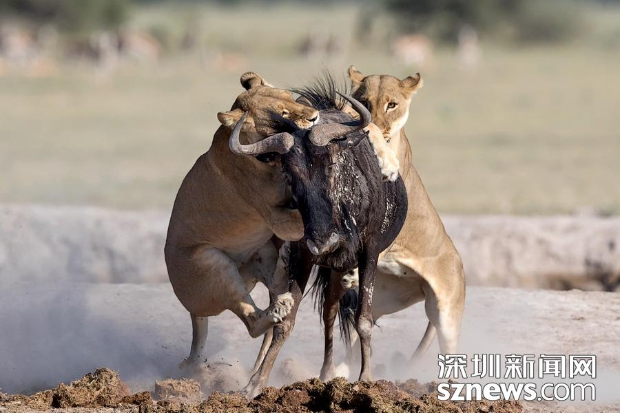 英國攝影師蘇-莫里斯(Sue Morri)在博茨瓦納Nxai Pan國家公園游玩,目睹了一場兇惡母獅獵食角馬的畫面。母獅甚至攀到了角馬背上,想要牢牢遏制住到手的“美餐”。強壯的角馬努力地與母獅抗?fàn)?,竭力想要保住自己的性命,但最終還是不敵母獅被拿下,最后成了母獅孩子們的盤中餐。
