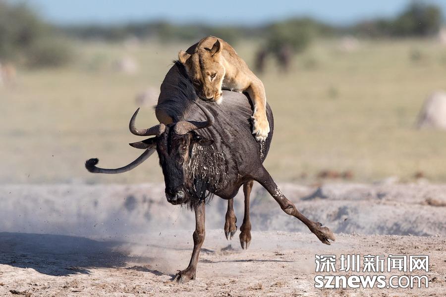 英國攝影師蘇-莫里斯(Sue Morri)在博茨瓦納Nxai Pan國家公園游玩,目睹了一場兇惡母獅獵食角馬的畫面。母獅甚至攀到了角馬背上,想要牢牢遏制住到手的“美餐”。強(qiáng)壯的角馬努力地與母獅抗?fàn)?,竭力想要保住自己的性命,但最終還是不敵母獅被拿下,最后成了母獅孩子們的盤中餐。