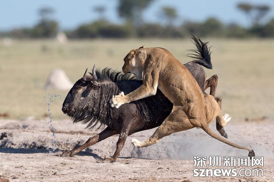 英國攝影師蘇-莫里斯(Sue Morri)在博茨瓦納Nxai Pan國家公園游玩,目睹了一場兇惡母獅獵食角馬的畫面。母獅甚至攀到了角馬背上,想要牢牢遏制住到手的“美餐”。強(qiáng)壯的角馬努力地與母獅抗?fàn)帲吡ο胍W∽约旱男悦?,但最終還是不敵母獅被拿下,最后成了母獅孩子們的盤中餐。