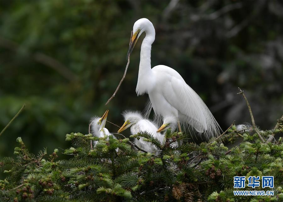 在江西省南昌市新建區(qū)象山森林公園內,白鷺和自己的雛鳥在一起(5月21日攝)。 近日,在江西省南昌市新建區(qū)象山森林公園內,已安家筑巢的大批鷺鳥陸續(xù)孵化出了后代。象山森林公園有著“鷺鳥王國”的美譽,生態(tài)環(huán)境良好,每年都會吸引白鷺、蒼鷺、夜鷺等鷺鳥飛抵棲息和繁衍后代。 新華社記者 彭昭之 攝