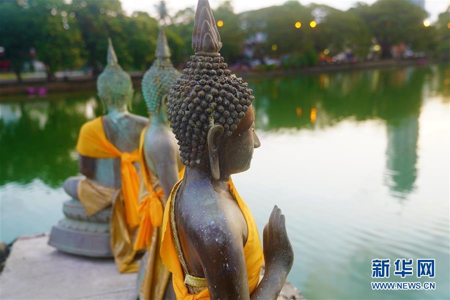 這是夕陽(yáng)下的斯里蘭卡科倫坡水中廟佛像(5月27日攝)。 在科倫坡貝拉湖上有一座木造樓閣——水中廟。木造建筑上面覆蓋著藍(lán)瓦,外圍環(huán)繞著線條優(yōu)美的佛像。樓閣外高臺(tái)上供奉的佛像,與不遠(yuǎn)處的高層建筑相互映照。祥和寧?kù)o的水中廟已成為人們修心、祈福的重要場(chǎng)所。 新華社記者唐璐攝