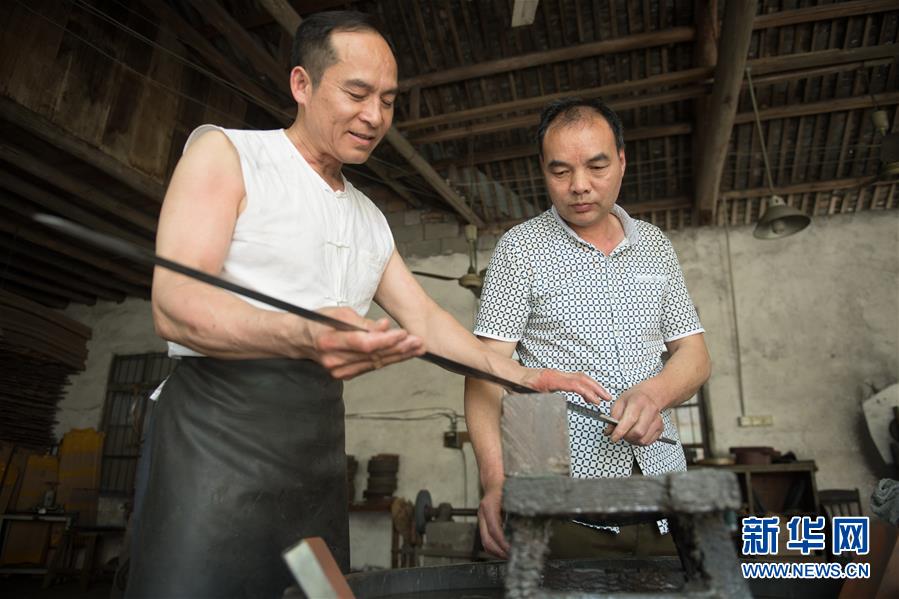 5月21日,鄭國榮(左)和磨劍師吳長友交流磨劍細(xì)節(jié)。吳長友是鄭國榮在國營劍廠的老同事,跟隨鄭鑄劍20余年。 新華社記者 翁忻旸 攝