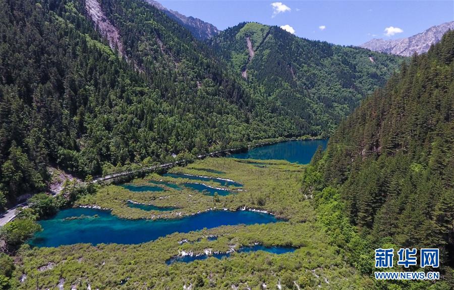 這是九寨溝景區(qū)內(nèi)一景(6月5日無(wú)人機(jī)拍攝)。新華社記者薛玉斌攝