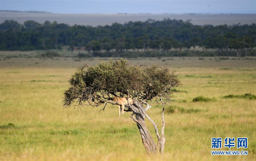 6月17日,在肯尼亞馬賽馬拉國家保護區(qū),一頭獅子在樹上休息。 新華社記者 李琰 攝