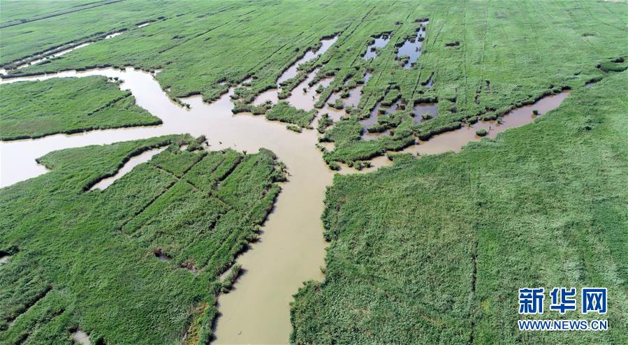 這是天津市寧河區(qū)七里海濕地內(nèi)蘆葦和水面形成的圖案(6月22日無人機(jī)拍攝)。新華社記者 岳月偉 攝