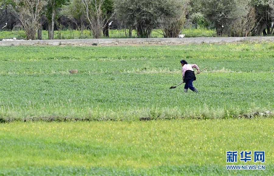 農(nóng)牧民在日喀則桑珠孜區(qū)郊外的青稞地里拔除雜草(6月22日攝)。新華社記者 張汝鋒 攝