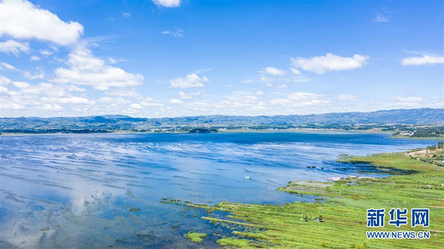 6月20日無(wú)人機(jī)拍攝的草海國(guó)家級(jí)自然保護(hù)區(qū),綠地部分是退耕還湖成果。 新華社記者 陶亮 攝