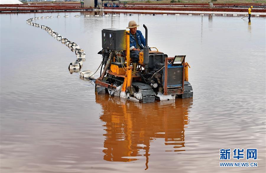 7月2日,唐山海港經(jīng)濟(jì)開發(fā)區(qū)大清河鹽場的工人在操作機(jī)械設(shè)備收獲春鹽。新華社記者 楊世堯 攝