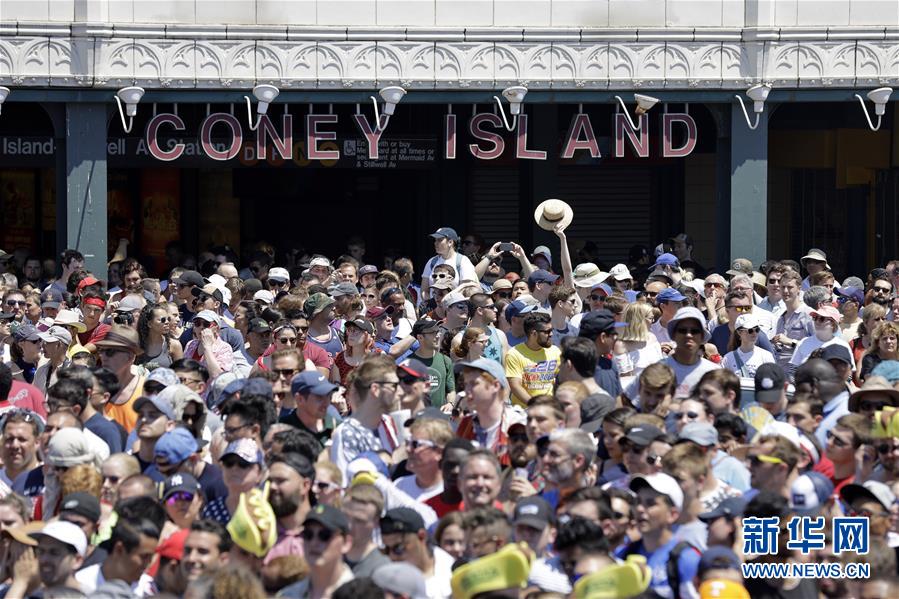 7月4日,在美國紐約康尼島,人們觀看吃熱狗大賽。新華社記者 李木子 攝