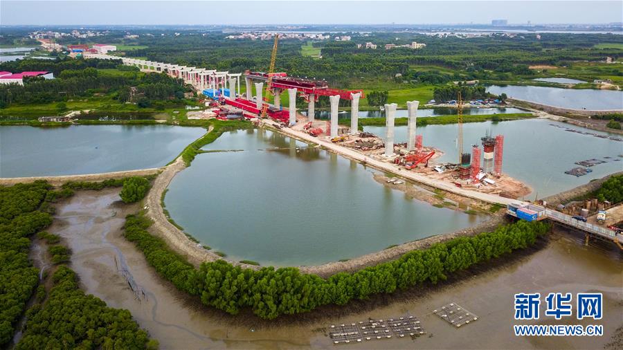 這是7月6日無人機(jī)拍攝的湛江調(diào)順跨海大橋東岸移動(dòng)模架施工現(xiàn)場(chǎng)。 新華社記者 劉大偉 攝