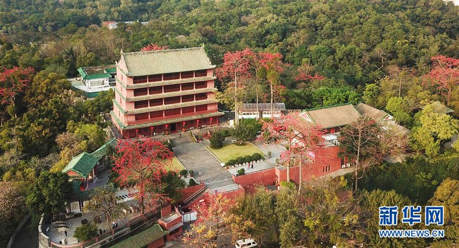 盛開(kāi)的木棉花和坐落在廣州越秀山上的鎮(zhèn)海樓交相輝映(2月22日無(wú)人機(jī)拍攝)。 新華社記者 鄧華 攝