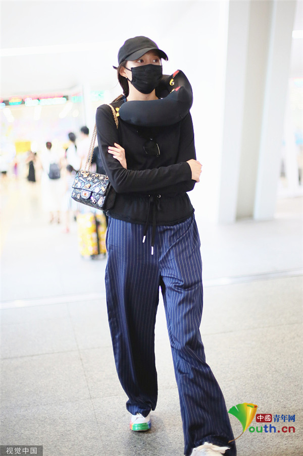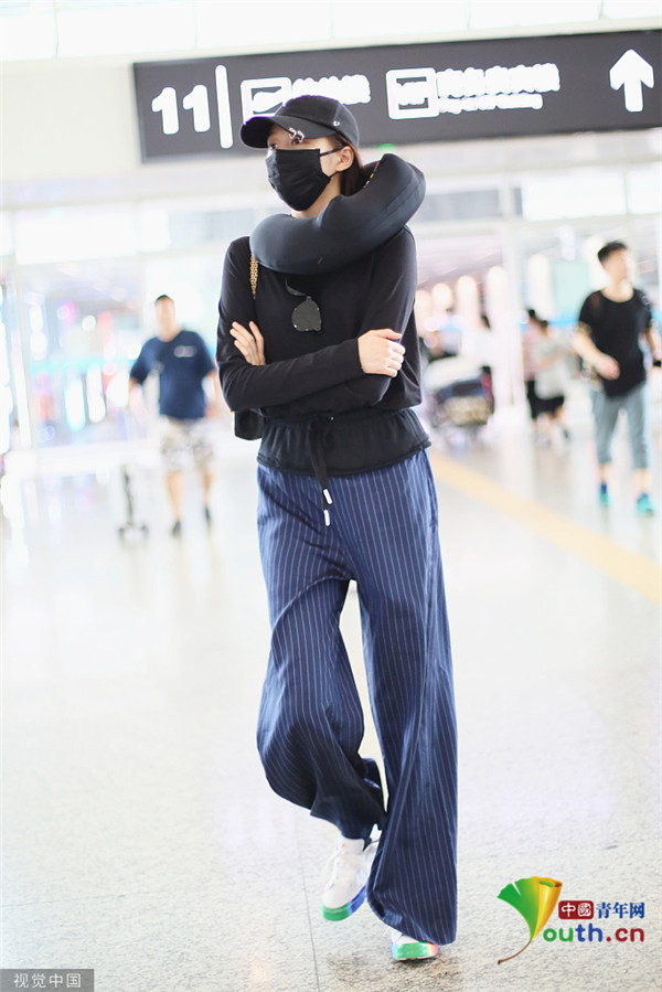 關曉彤淡定抱臂行走 脖子上掛U型枕毫無偶像包袱