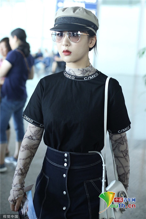 2019年7月25日,北京,楊紫現(xiàn)身機場。她穿黑色短T配牛仔裙變時髦女郎,戴報童帽架墨鏡”港風女sir“即視感,人氣爆棚。