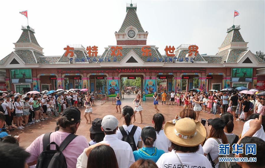 7月31日,列娜(前排左)在沈陽(yáng)方特歡樂(lè)世界門(mén)前表演舞蹈。