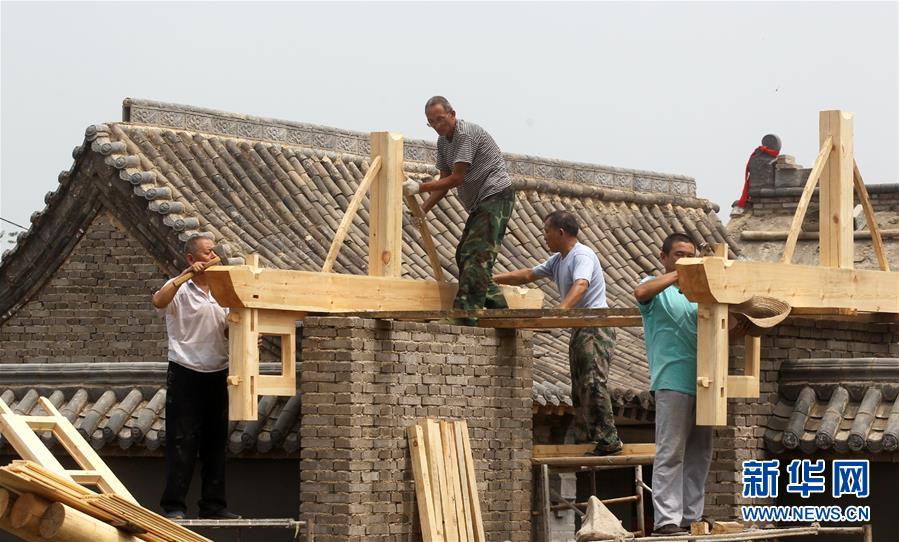 8月7日,在石家莊市井陘礦區(qū)橫西村,工作人員在組裝門樓建筑木架。 新華社記者駱學(xué)峰攝