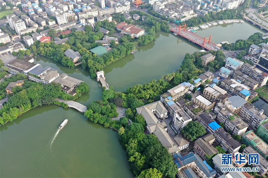 桂林市榕湖附近景觀(7月1日無人機(jī)拍攝)。 夏日時(shí)節(jié),廣西桂林市區(qū)內(nèi)的榕湖、杉湖、桂湖、木龍湖等地綠樹成蔭、景色迷人。 新華社記者陸波岸攝