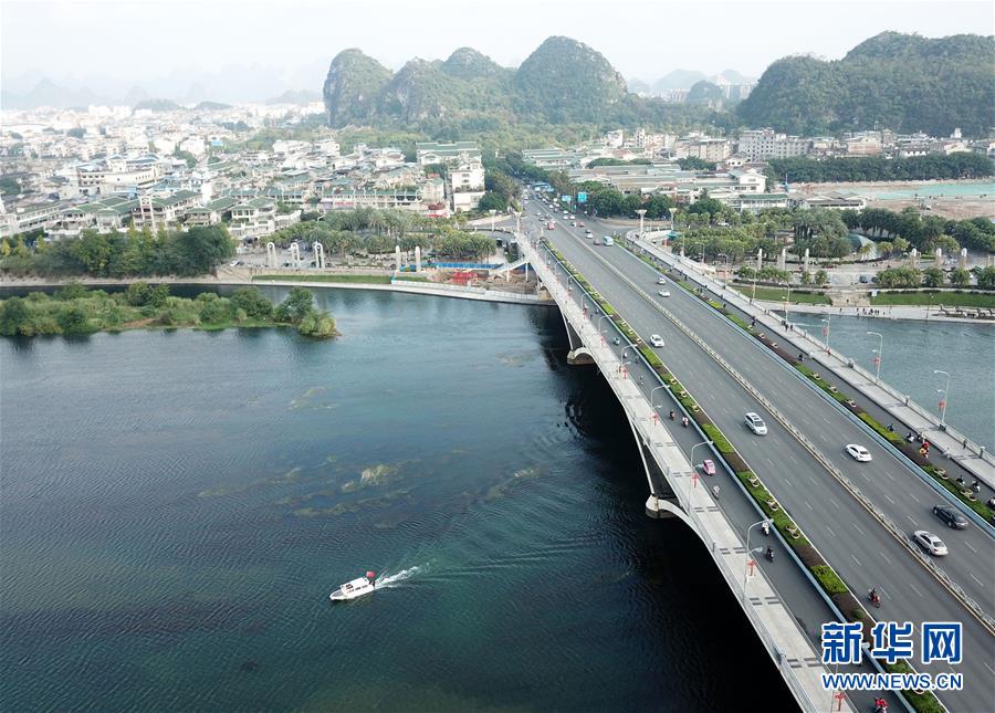 船只從橫跨漓江的廣西桂林市解放橋旁駛過(10月17日無人機拍攝)。 新華社記者 周華 攝