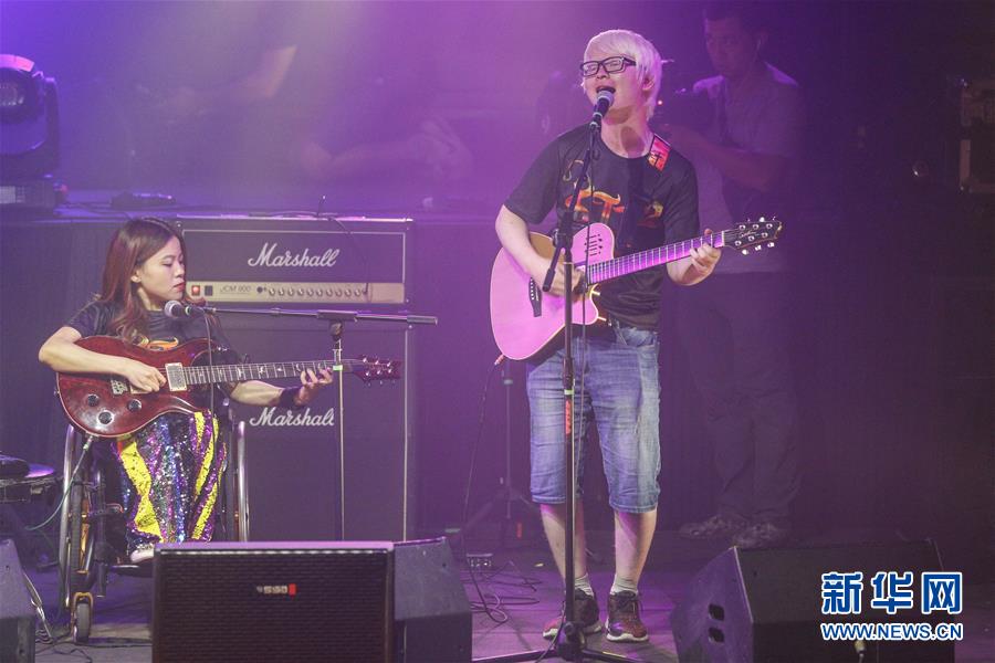 8月14日,8772樂隊(duì)成員謝航程(右)和程利婷在演唱會上表演。新華社記者張玉薇攝