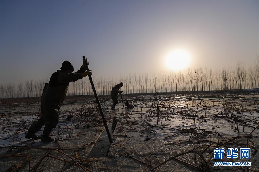 2月1日,在雄安新區(qū)安新縣東向陽村的一處藕塘,挖藕工將塘面結的冰用電鋸切成小塊后挪開。新華社記者沈伯韓攝