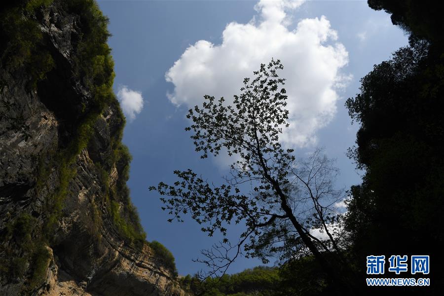 這是在地洞河天坑底部拍攝的植物。位于陜西省漢中市寧強(qiáng)縣的地洞河天坑,是禪家?guī)r天坑群中規(guī)模最大的一處天坑,坑內(nèi)分布有石鐘乳、石筍,具有極高的地質(zhì)研究價(jià)值。新華社 張博文 攝