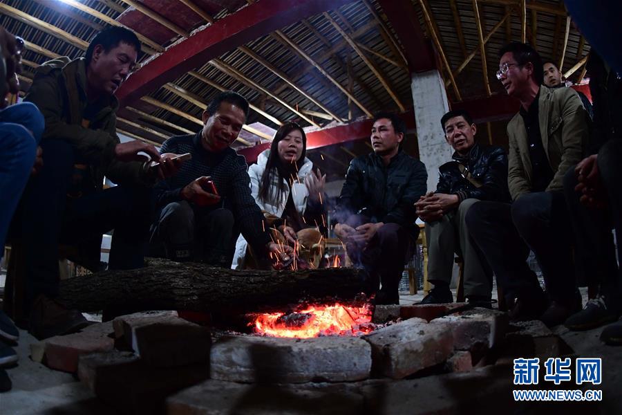 龍革雄(左二)和回家開辦農家樂的村民商量相關事宜(2017年2月25日攝)。 新華社記者 黃孝邦 攝