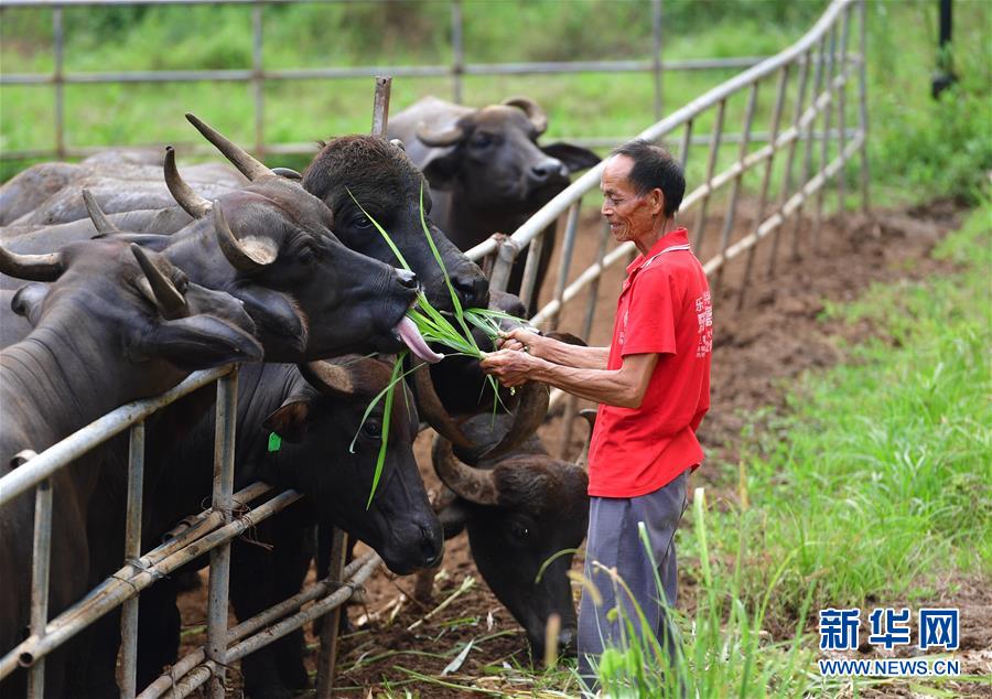 在廣西融安縣大良鎮(zhèn)古蘭村古蘭屯養(yǎng)牛基地,68歲的韋肇翠在喂牛(8月18日攝)。韋肇翠是養(yǎng)?;氐娘曫B(yǎng)員,每個月有2800元的工資。 新華社記者 黃孝邦 攝