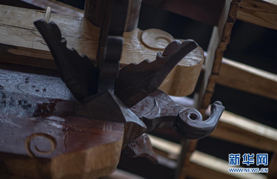 位于石屏縣異龍鎮(zhèn)符家營村一戶老屋中“修舊如舊”的房梁(8月8日攝)。新華社記者 江文耀 攝