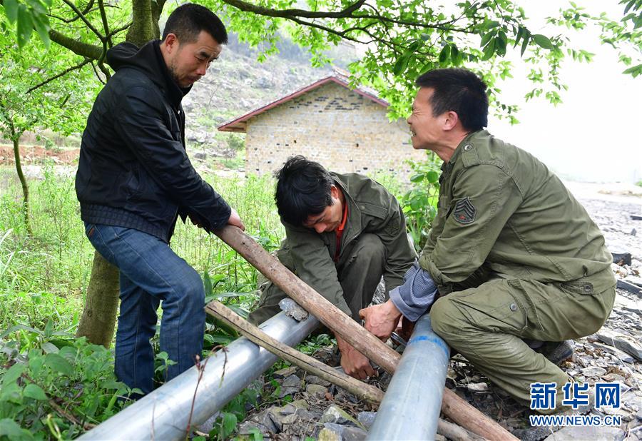 龍革雄(右)和堂兄弟們在架設引水管道(2017年4月7日攝)。新華社記者 黃孝邦 攝