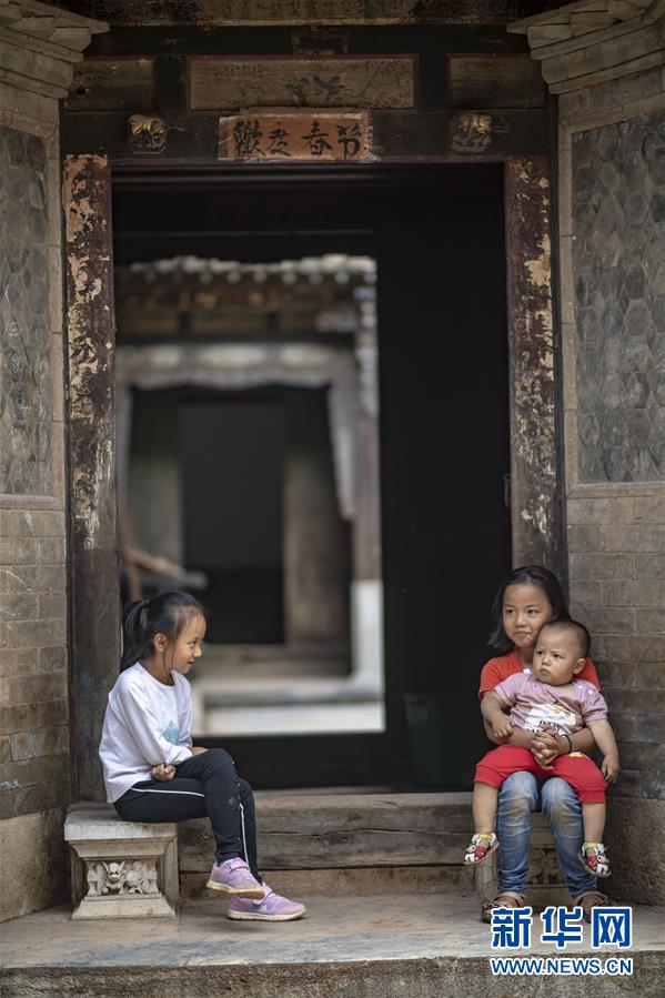 石屏縣異龍鎮(zhèn)符家營村的小朋友鄭淇(左)與小伙伴在村里的老屋門前休息(8月8日攝)。新華社記者 江文耀 攝