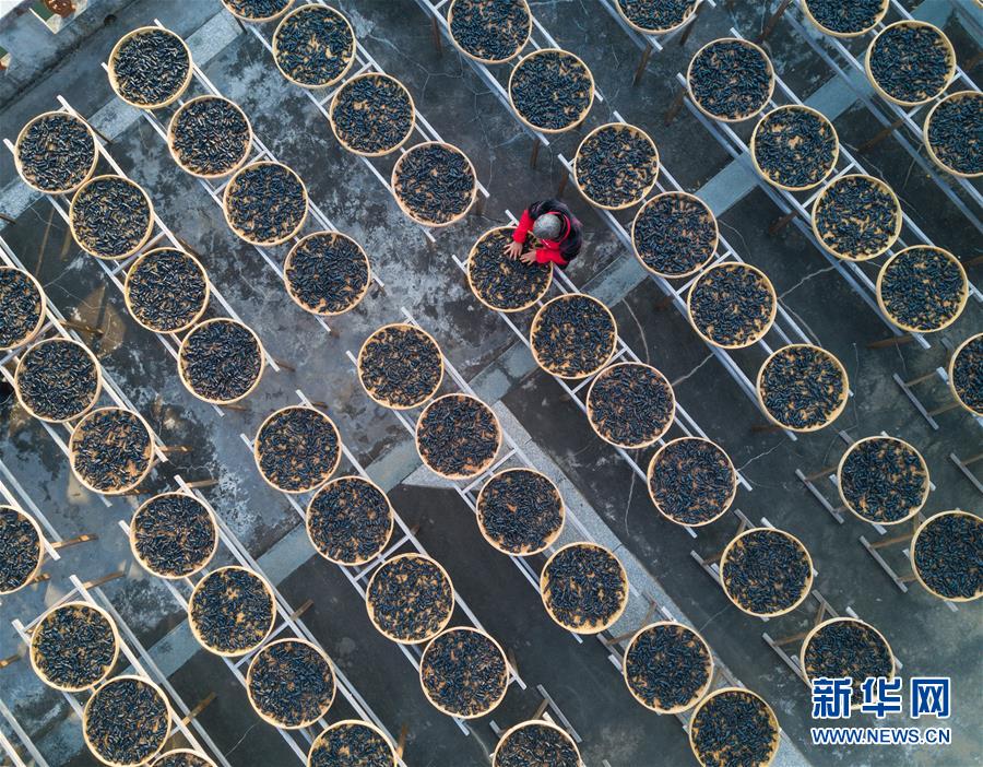 在福建省永春縣岵山鎮(zhèn)茂霞村熟地文創(chuàng)園,村民在晾曬用當(dāng)?shù)貍鹘y(tǒng)手藝制作的藥材——熟地(1月28日無人機(jī)拍攝)。 新華社記者 宋為偉 攝