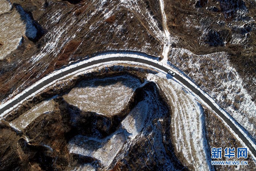 車輛行駛在王莊溝村通往大有鄉(xiāng)的道路上(2月16日無人機拍攝)。 新華社記者 詹彥 攝