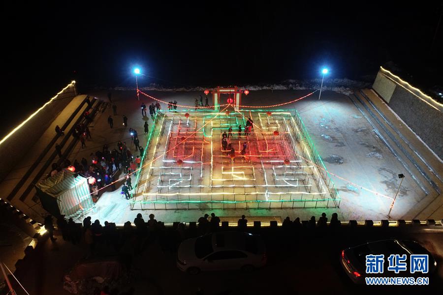 在武鄉(xiāng)縣大有鄉(xiāng)王莊溝村廣場上,村民們在九曲黃河燈陣中觀燈(2月16日無人機(jī)拍攝)。 新華社記者 詹彥 攝