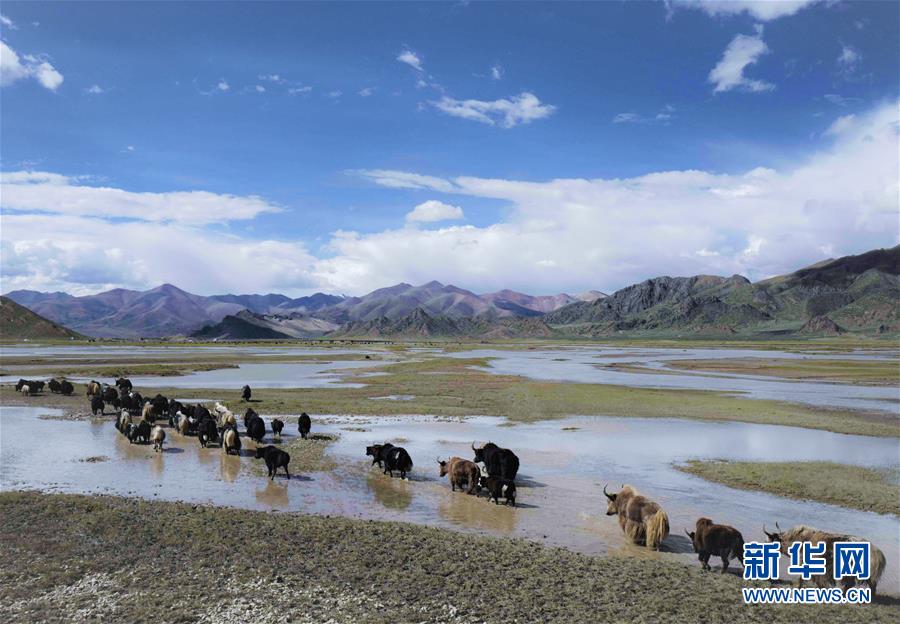 一群牦牛走過藏北濕地(2018年9月7日攝)。新華社記者 普布扎西 攝