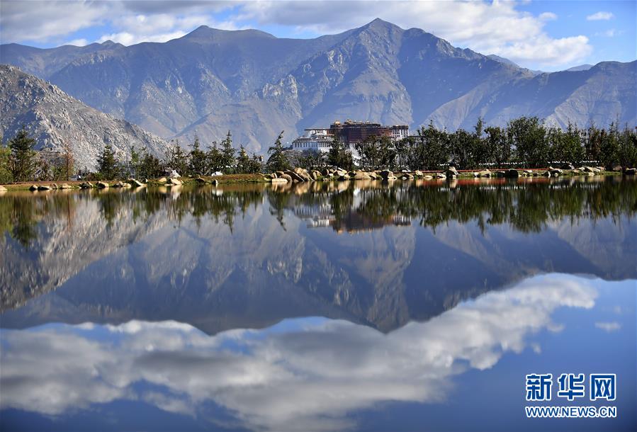 藍(lán)天白云和綠水之間的布達(dá)拉宮(6月5日攝)。 新華社記者 覺果 攝