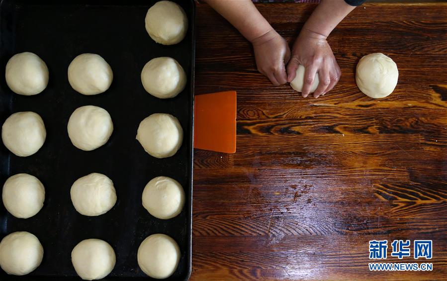 8月29日,付艷梅將發(fā)酵好的面團(tuán)揉捏成型。新華社記者淡航攝