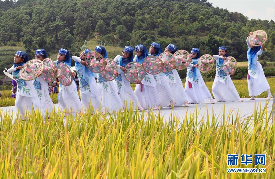 9月15日,孩子們在田野里表演舞蹈《豐收麥田》。 金秋時節(jié),云南省尋甸回族彝族自治縣在七星鎮(zhèn)魯古村舉行慶祝豐收活動。 新華社記者 楊宗友 攝