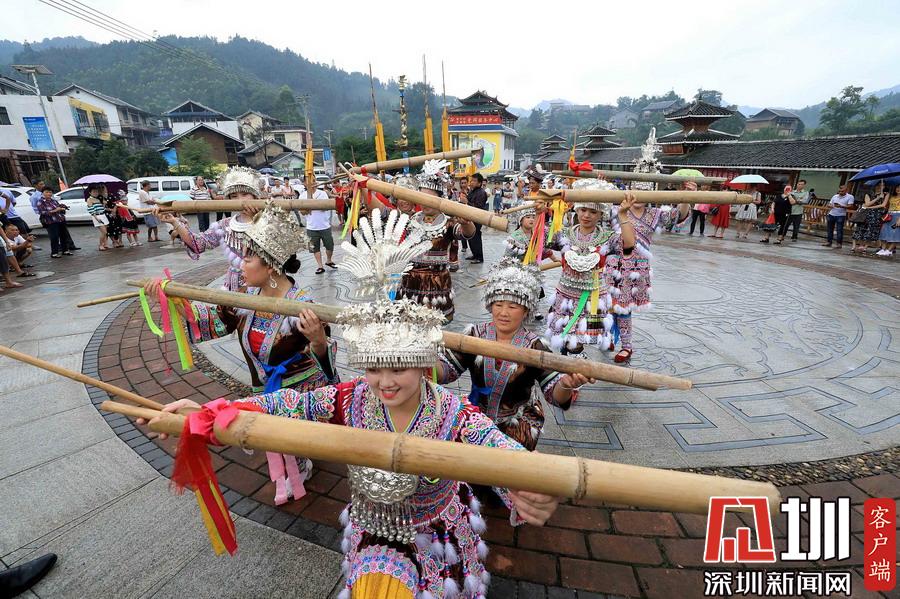 在廣西柳州市融安縣安寧村大袍屯,苗族群眾在“鬧魚”活動中表演蘆笙踩蹚舞。