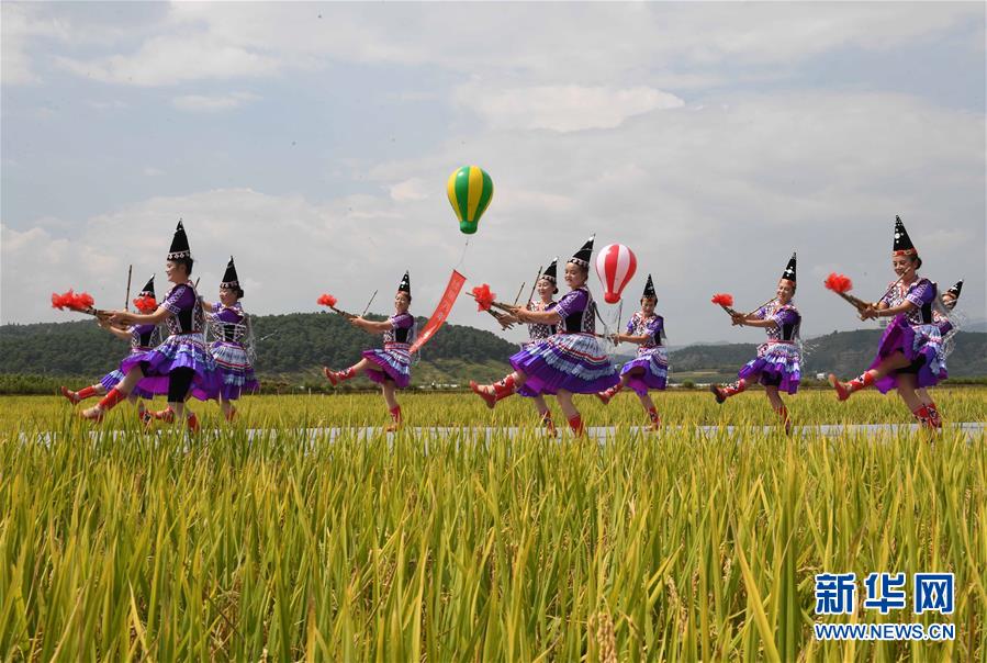 9月15日,人們?cè)谔镆袄锉硌菸璧浮洞淀懱J笙慶豐收》。新華社記者 楊宗友 攝