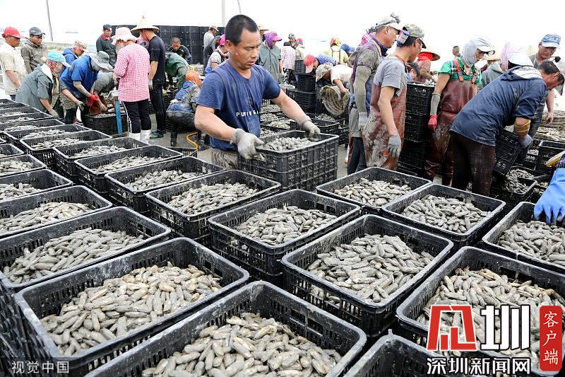 2019年7月9日,漁民們?cè)诮K連云港沿海地區(qū)海邊的灘涂上將剛收獲的海蟶運(yùn)送上岸裝箱外運(yùn)。