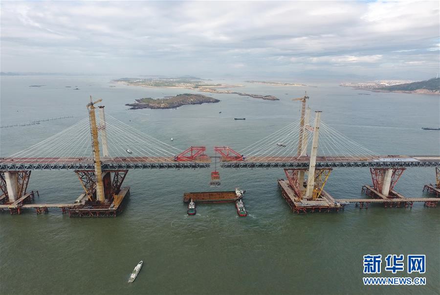9月21日,平潭海峽公鐵大橋鼓嶼門航道橋鋼桁梁被架梁起重機穩(wěn)穩(wěn)地提升起來(無人機拍攝)。新華社記者林善傳攝